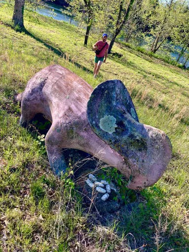 A nephew climbed a Mastadon’s tusk and surveyed the water, a niece climbed the ankylosaurus’ back, we were all glad to be there, all had fun. It was my first time among the dinosaurs, I’d never gone over the wire, only observed it distantly from the road, and was glad for the company. Look what we found!