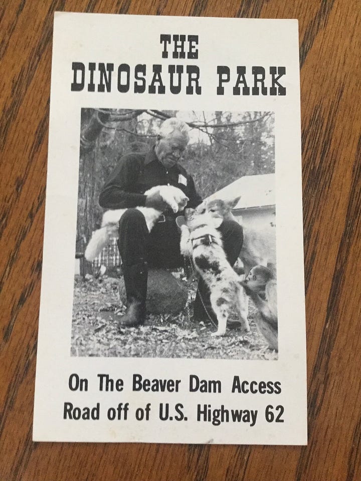 This was once the largest roadside dinosaur park in the world, a place advertised by a small card size flyer featuring Ola—a big man with a shock of white hair dressed like Johnny Cash hand-feeding feeding his pets—a cat, dog, deer, and what appears to be a monkey with—“The Dinosaur Park”as superscript and the — On the Beaver Dam Access Road off of U.S. Highway 62 as subscript.