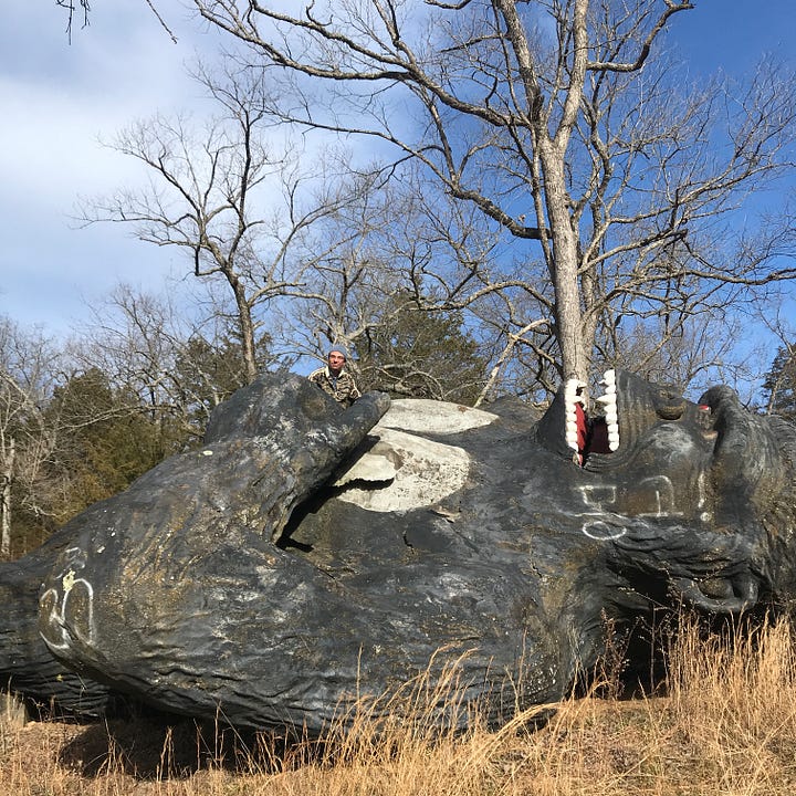 I went back there this spring with my friend Hannah after we got done camping at nearby Lake Leatherwood, where by the bathroom there’s a giant Bigfoot carved out of wood. Bigfoot is seated like Lincoln at the memorial in Washington. You can get pictures in his lap.