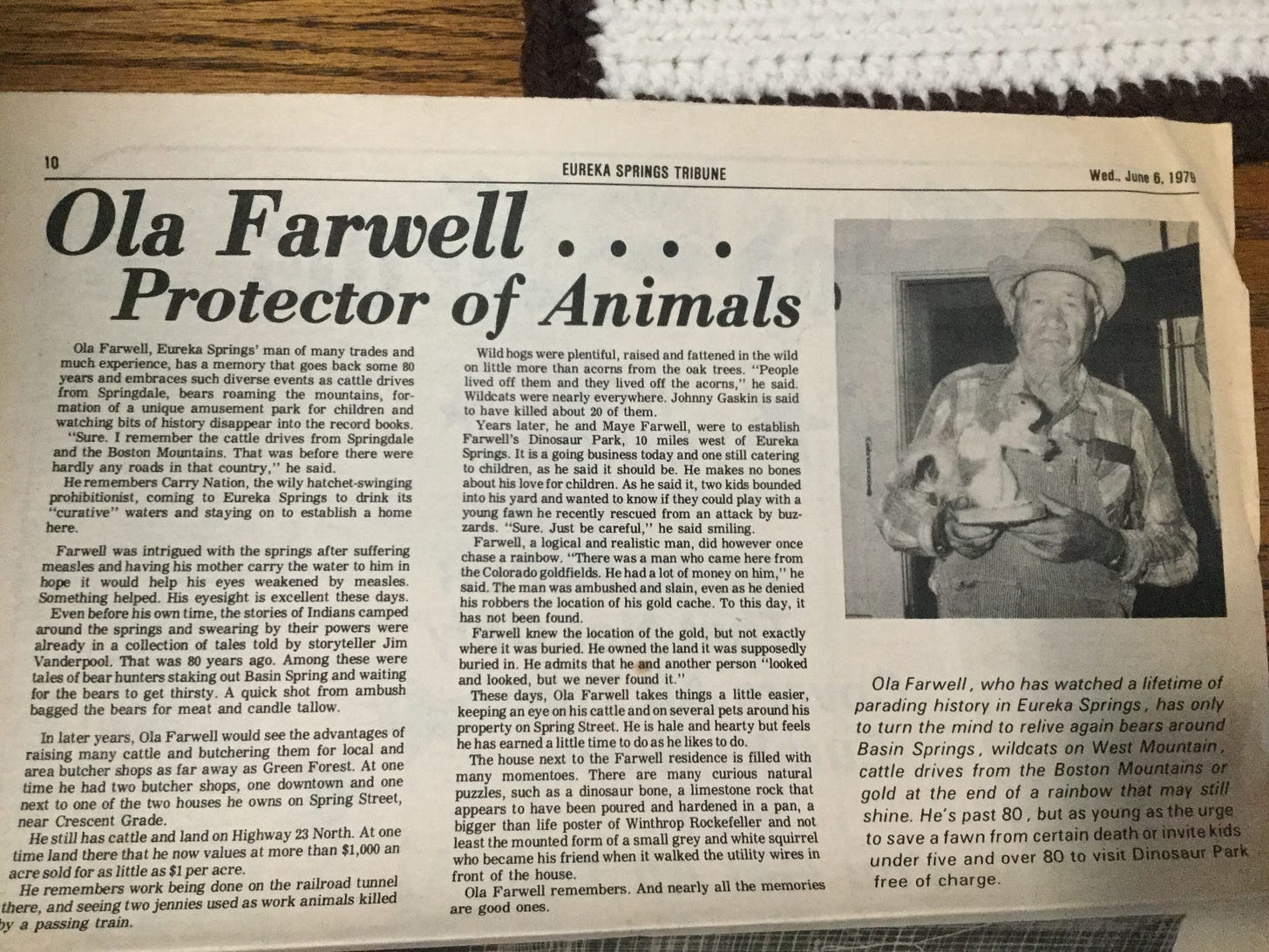 Let’s drive from here, the Dinosaur Park on Spider Creek, back to Eureka Springs; we pass bait shops on switchbacks around a lush and verdant valley; just before town there’s Inspiration Point, next to the Velvet Otter, down the street from the Rowdy Beaver, which is up the hill from The Cat House. The place with the dinosaur in the yard, across from Magnetic Mountain that I’ve been attracted to, was built by a long lost cousin of mine, a cattleman named Ola Farwell.