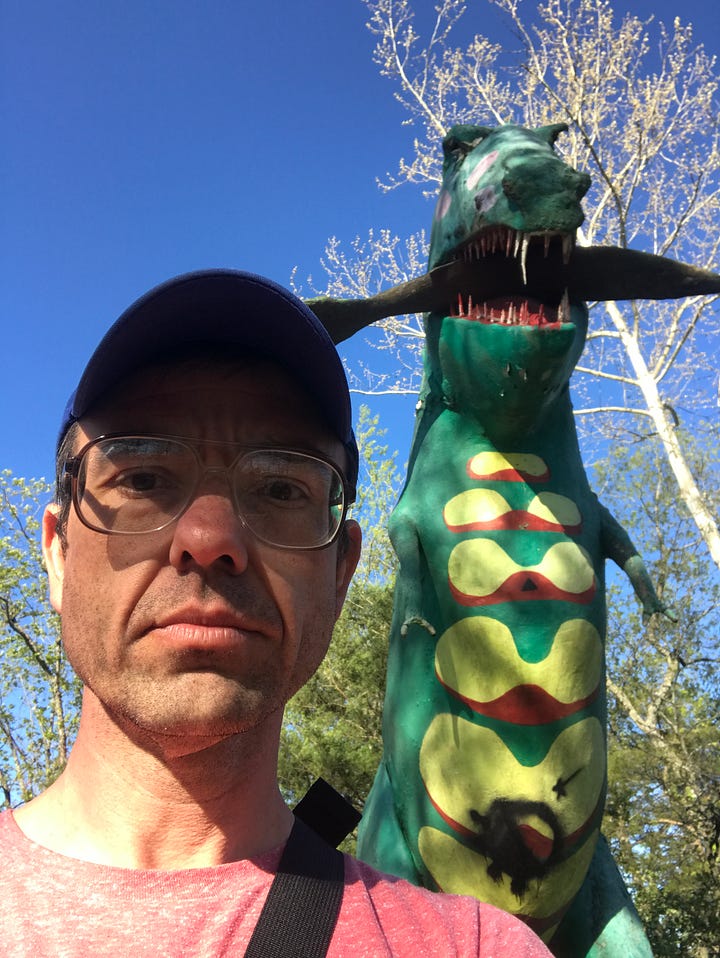 We did a quick loop around the park, took pictures, saw a copperhead snake on the gravel by the two story tall T-Rex with the fish in its mouth. That T-Rex, for some reason, provided b roll and was on the poster and DVD for the 2005 Cameron Crowe film Elizabethtown, a middling movie with Kirsten Dunst and Orlando Bloom that, I’ll note, is set in Kentucky.